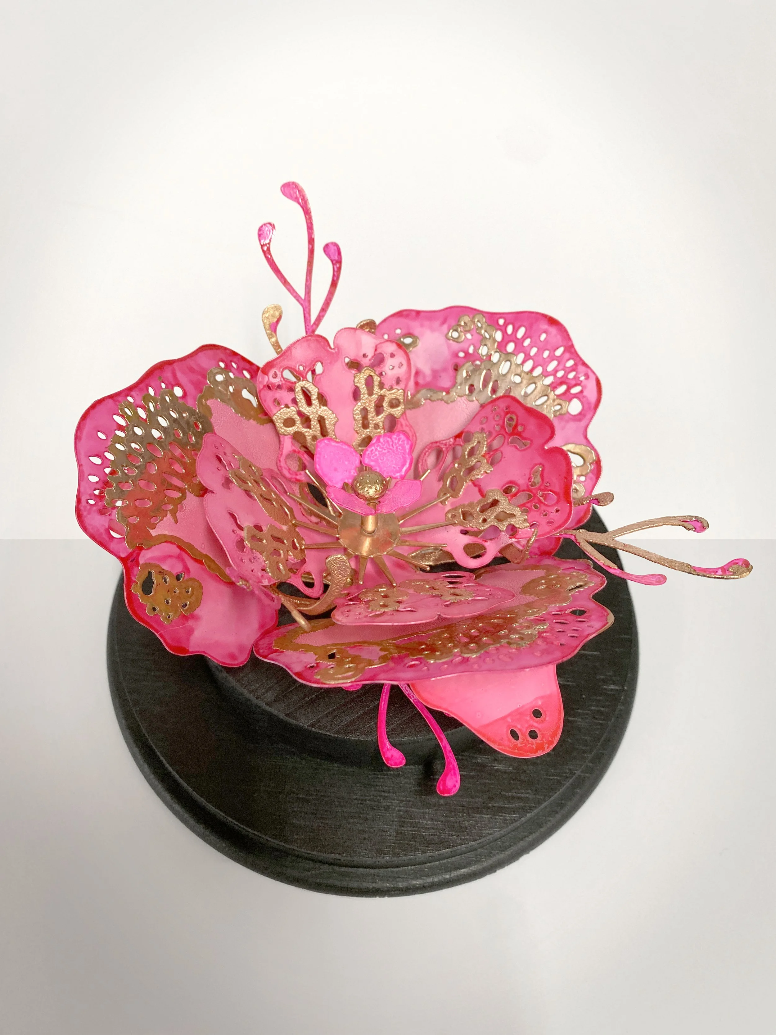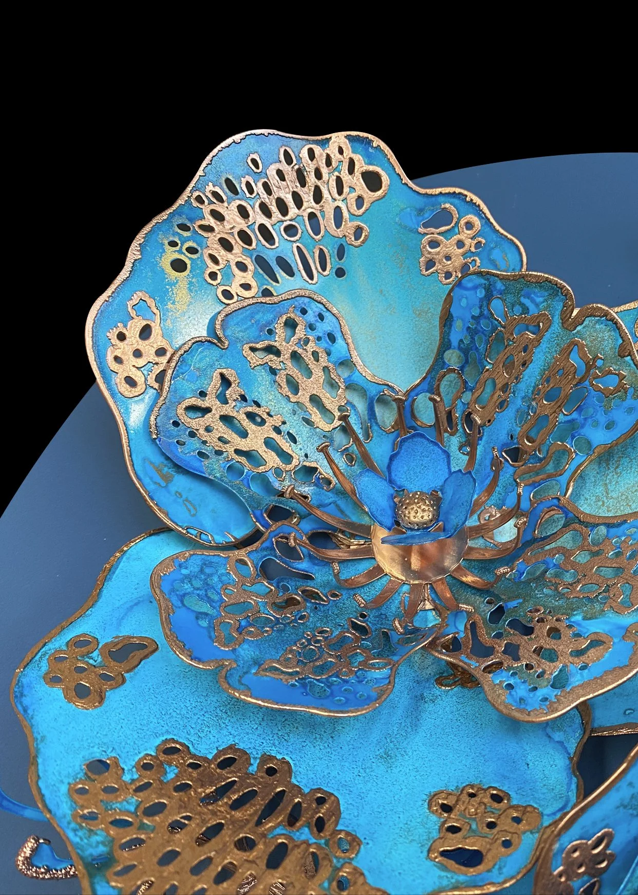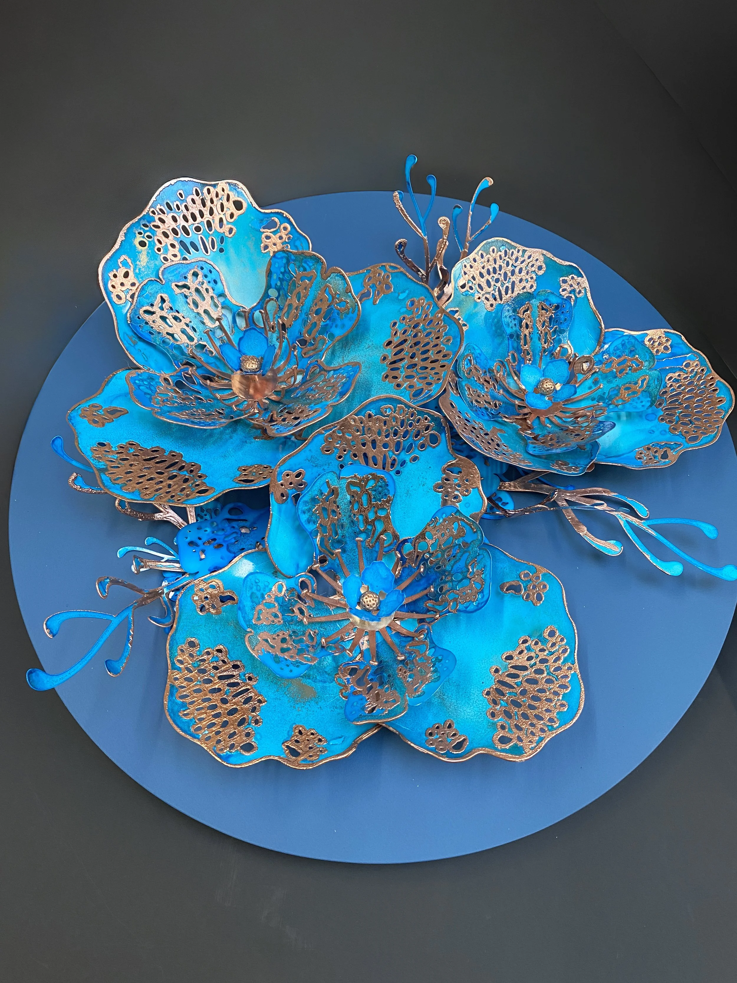 I combine layered structures with experimental surface treatments; including acrylics, alcohol inks and copper electro forming.