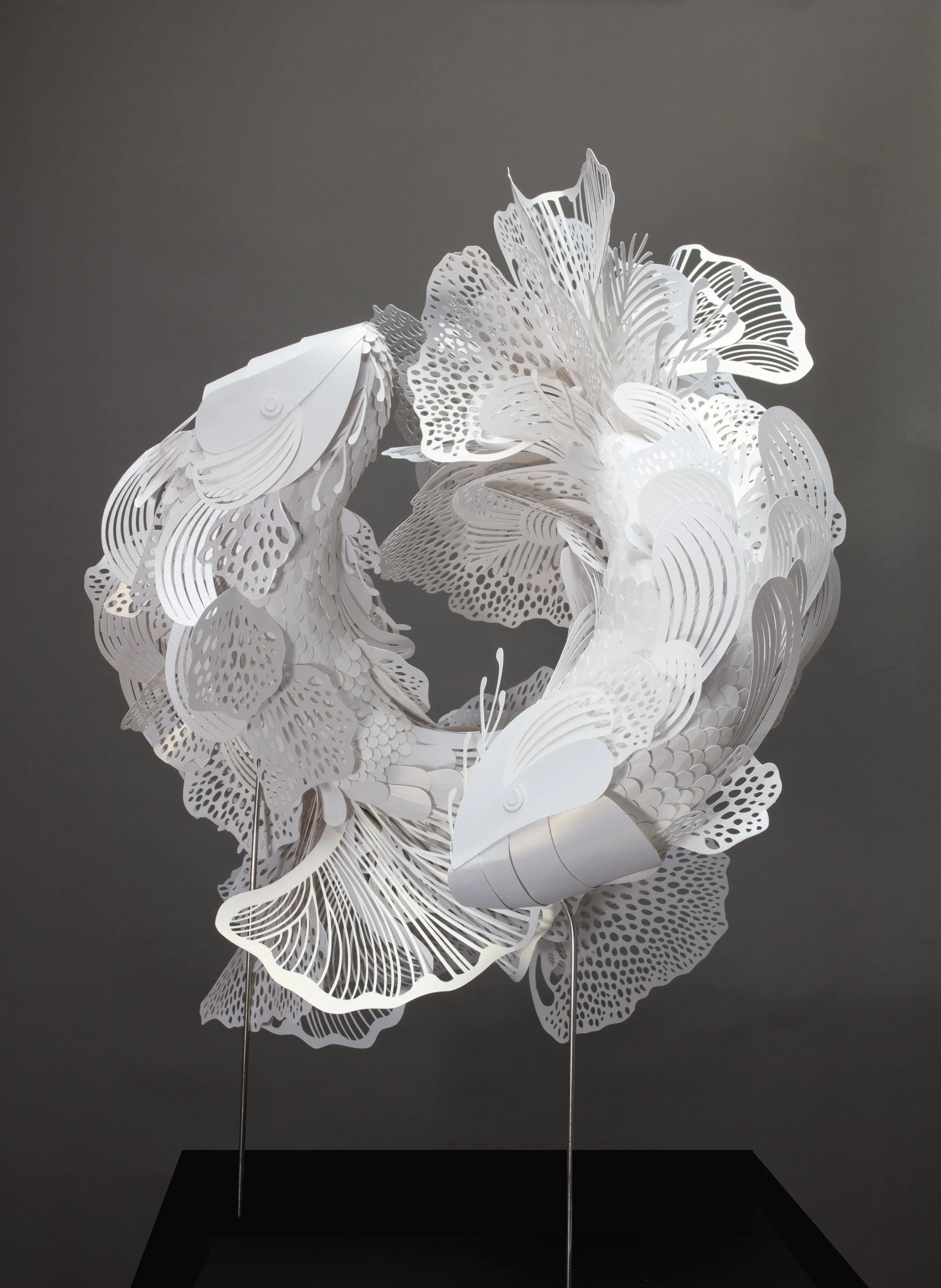 The work is made entirely from paper and card, including the internal structure and external textures.