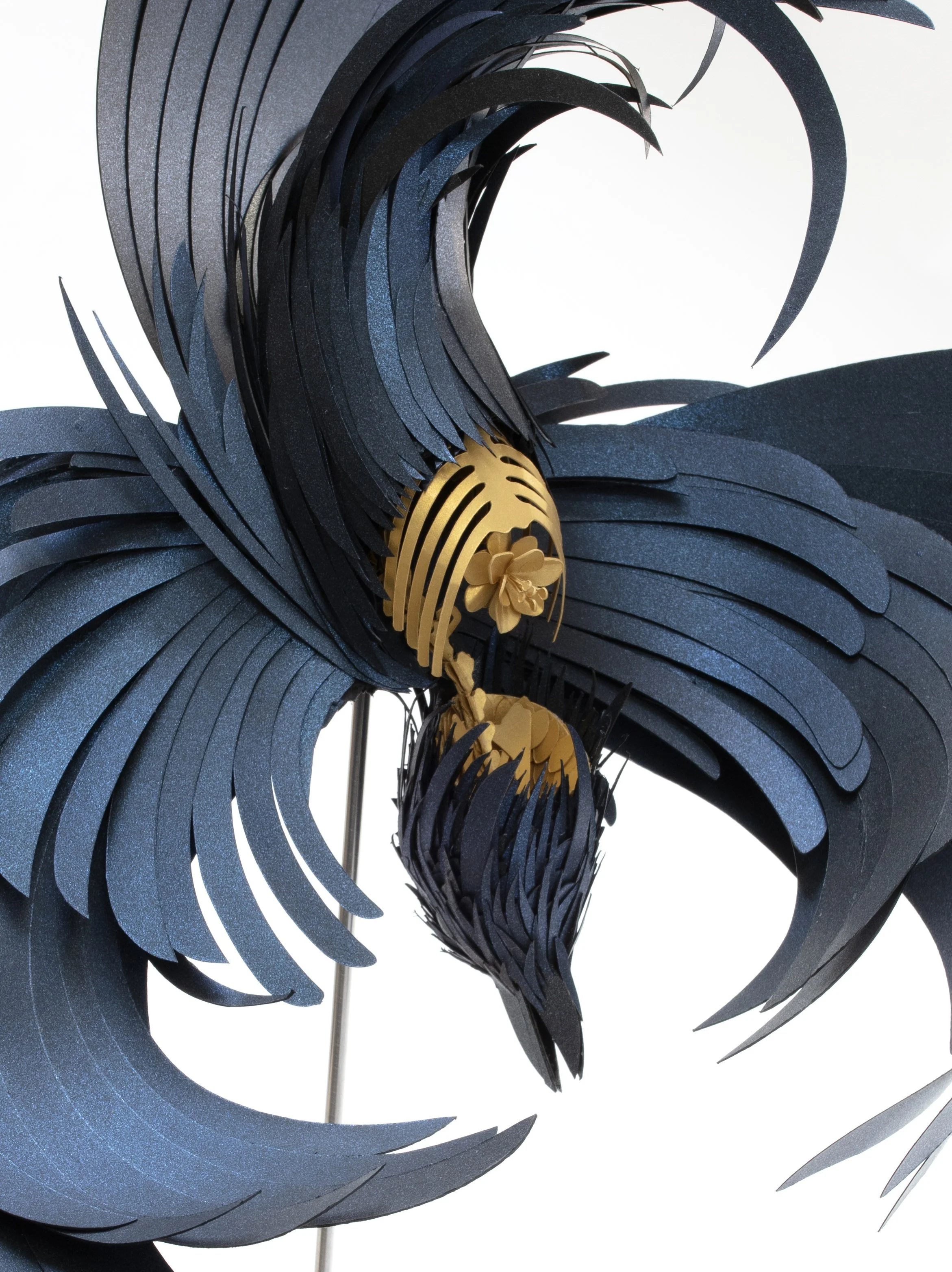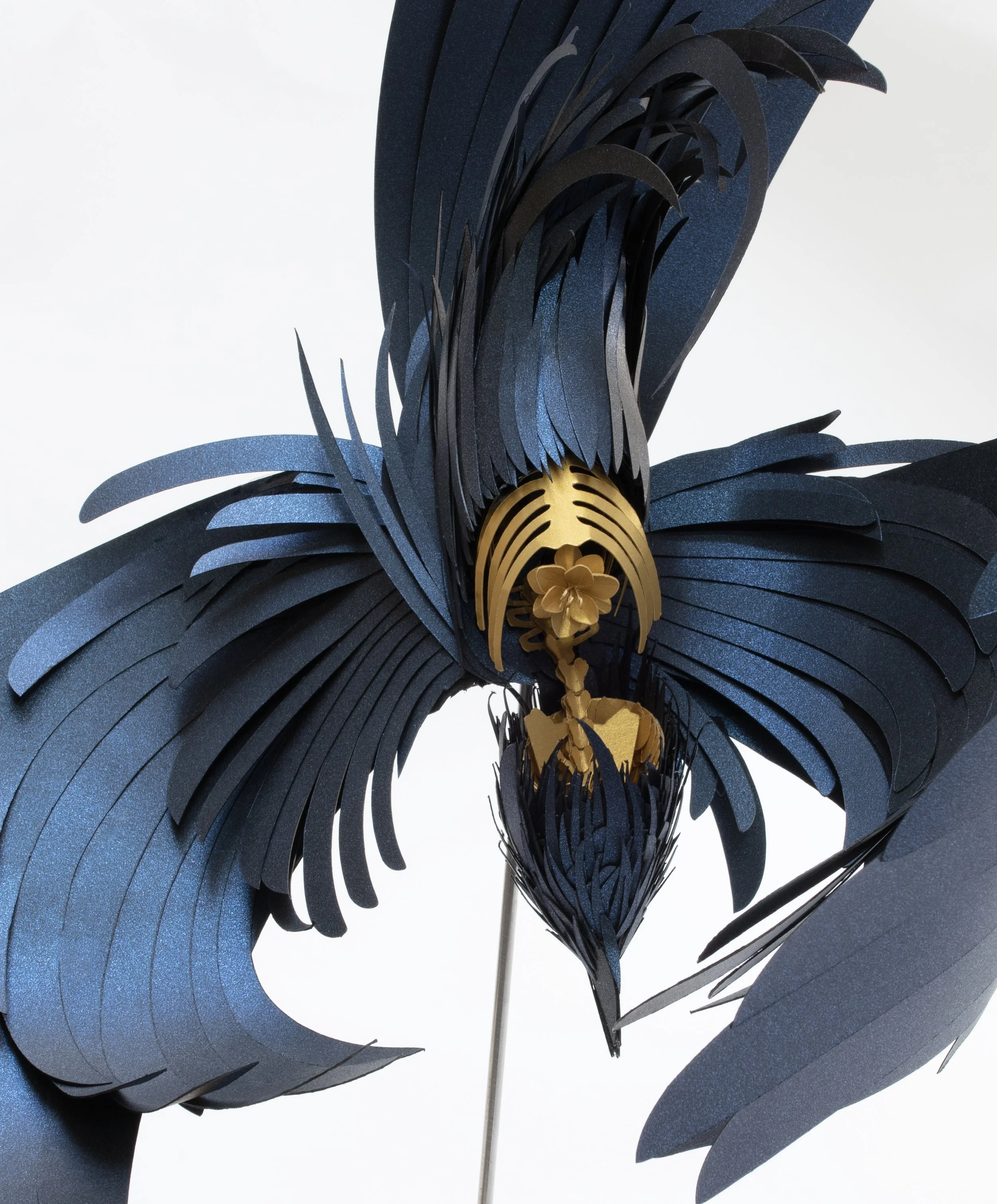 The internal structure and external texture are made entirely from paper and card. With over a thousand hand cut iridescent paper pieces. The inspiration is drawn from tragic global events in 2019 and 2020 and is an image Lisa held in her mind for over 2 years before she felt ready to create it. The gold human ribcage surrounds a delicate flower, representing the life and spirit of a child in a parents chest.